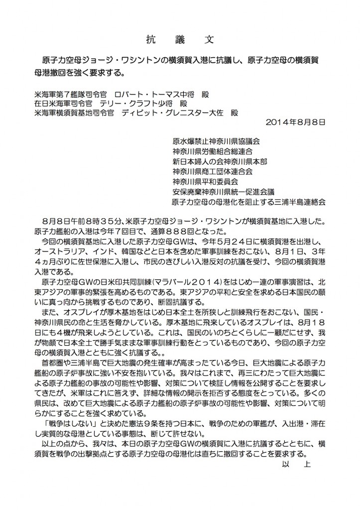 北東アジアで軍事訓練をくり返し、アジアの軍事的緊張を高めている米軍と同盟国の訓練の中心を担うGWの入港に抗議するため、神奈川県原水協は本日[8日]、午後3時より、米海軍横須賀基地ゲート前集合で抗議文を提出して申し入れをおこないます。
