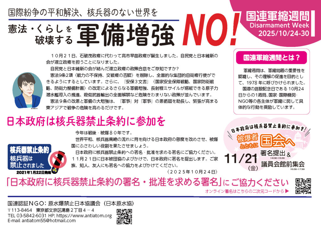 被爆80年、核兵器禁止条約への参加・批准は被爆者と7割を超える国民の声です。日本政府に、核兵器禁止条約への署名・批准をご一緒にもとめてまいりましょう。
