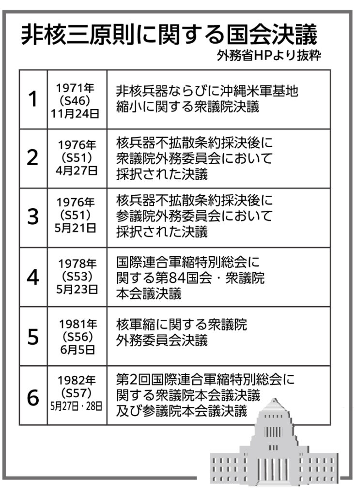 高市早苗首相は日本の国是である「非核三原則」(核兵器を持たず、つくらず、持ち込ませず)を敵視し、「安保3文書」(国家安全保障戦略、国家防衛戦略、防衛力整備計画)の改定に関連して、「国家安全保障戦略」に明記されている文言「非核三原則を堅持する」の削除、見直しをすすめようとしています。