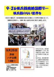 「ヒバクシャ国際署名」推進連絡会は9月26日の核兵器廃絶国際デーに合わせて、午後2時から渋谷ハチ公前で署名行動を予定しています。