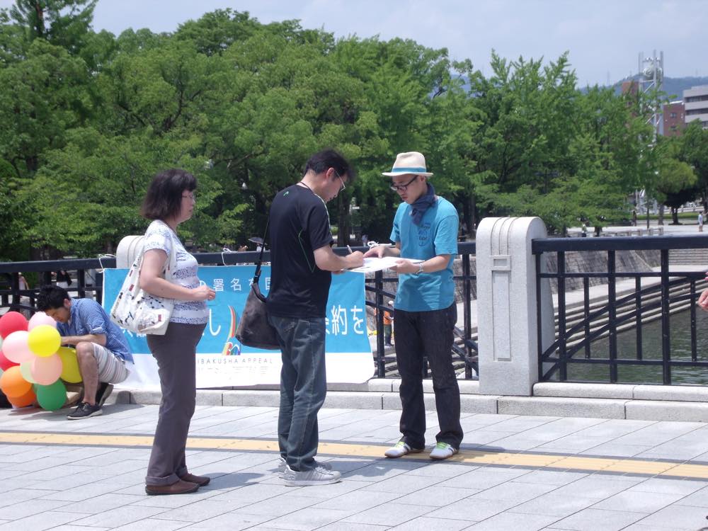 パレード終了後、20人が元安橋で「ヒバクシャ国際署名」を市民と観光客に呼びかけました。