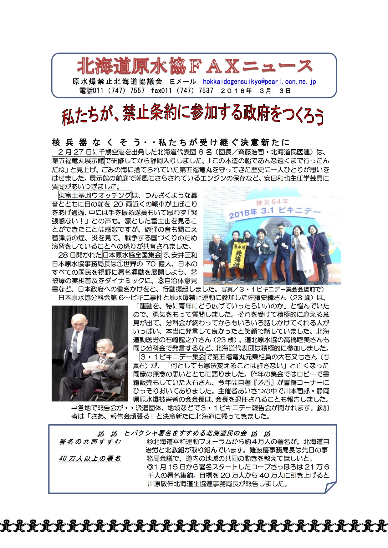 【北海道】核兵器なくそう・・私たちが受け継ぐ決意新たに 02 3・1ビキニデー X Facebook はてブ LINE コピー 2018.03.032018.03.05 ▲クリックするとPDFファイルが開きます