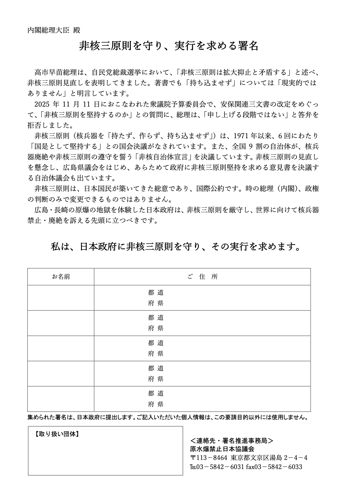 高市早苗首相に非核三原則を守り、実行を求める署名(5名連記・肩書き) 05 署名 X Facebook はてブ LINE コピー 2025.12.27 非核三原則署名(5名連記)ダウンロード Word版 非核三原則署名(5名連記)ダウンロード 非核三原則署名(肩書き署名)ダウンロード Word版 非核三原則署名(肩書き署名)ダウンロード